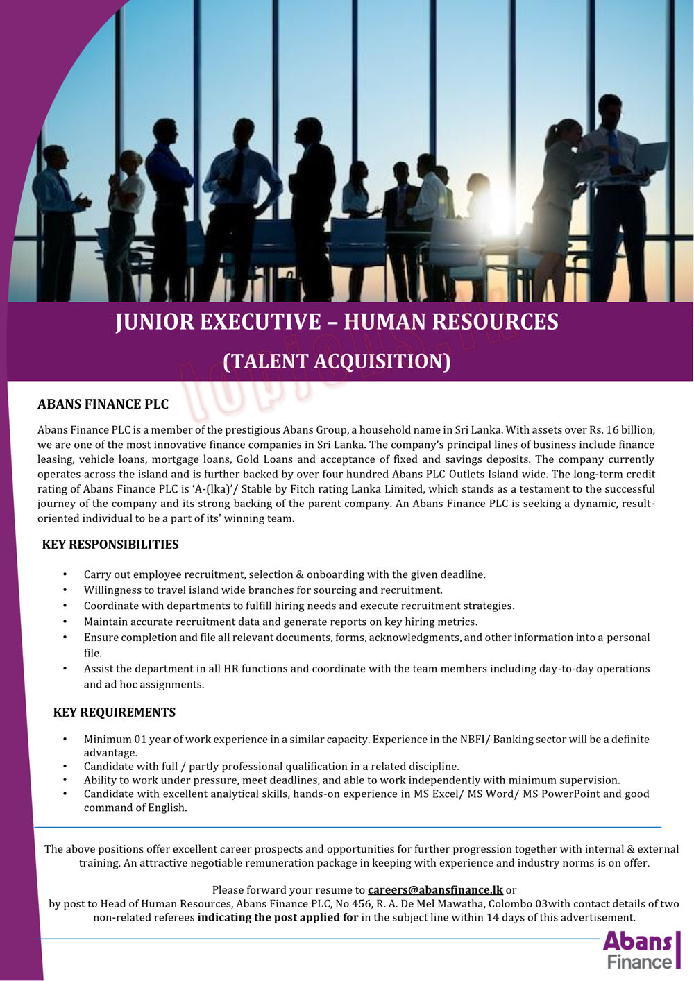 | Apply Online | Send your CV to Careers@abansfinance.lk |