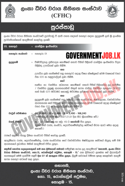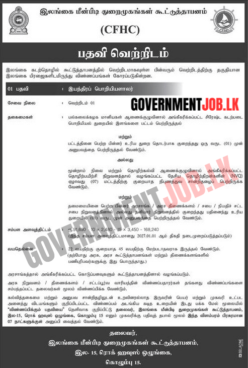 This position plays a key role in maintaining and developing mechanical systems related to harbour and fisheries infrastructure under the Ceylon Fishery Harbours Corporation.