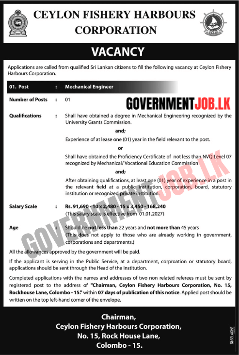The Ceylon Fishery Harbours Corporation Vacancies 2026 present an excellent opportunity for Mechanical Engineers and NVQ-qualified professionals seeking a reliable and well-paid government career. Eligible candidates are advised to apply promptly, as the closing period is limited.