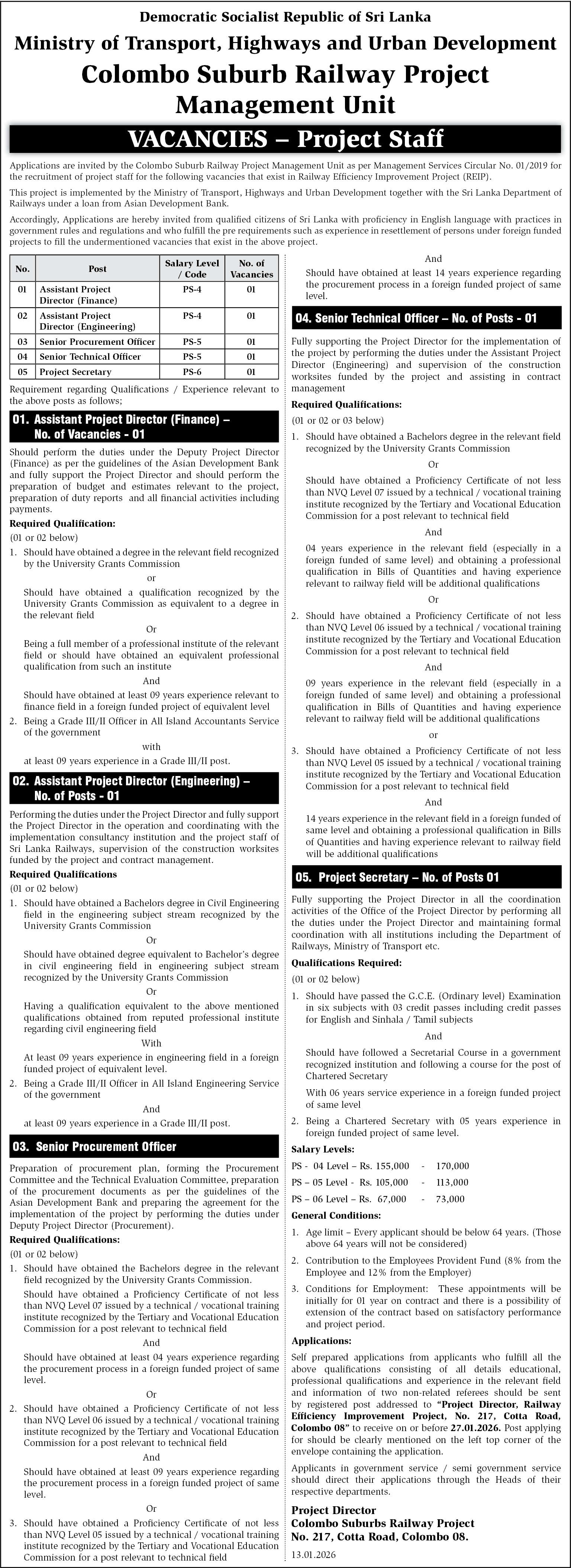 The Colombo Suburban Railway Project is expected to recruit for the following positions: