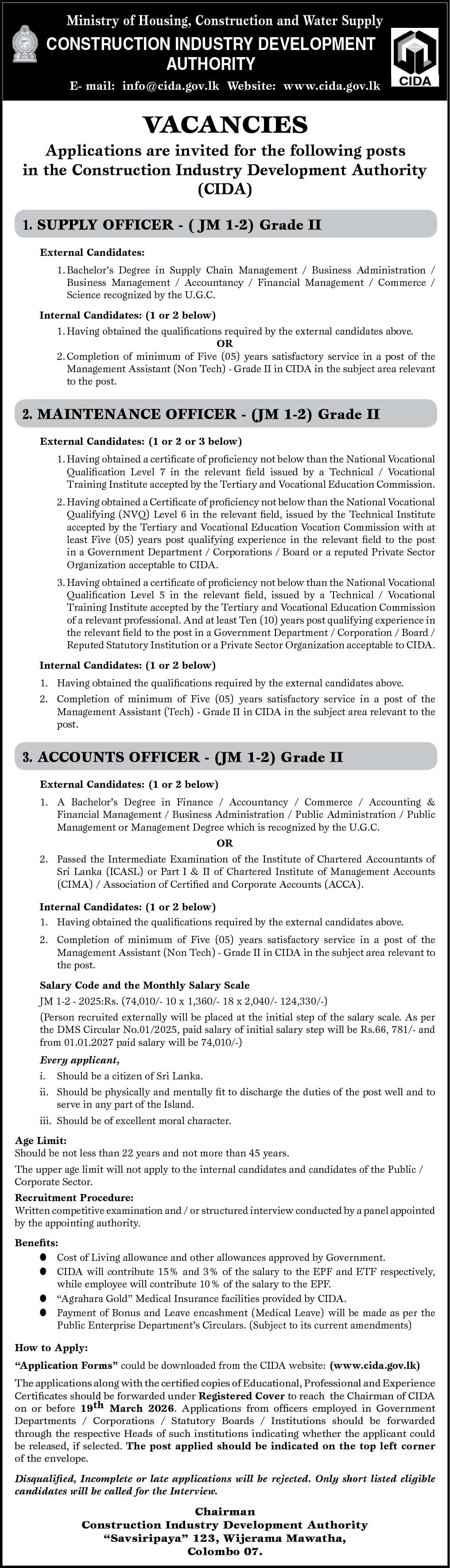 The Construction Industry Development Authority Vacancies 2026 notification has been officially issued by the Construction Industry Development Authority (CIDA) under the Ministry of Housing, Construction and Water Supply.