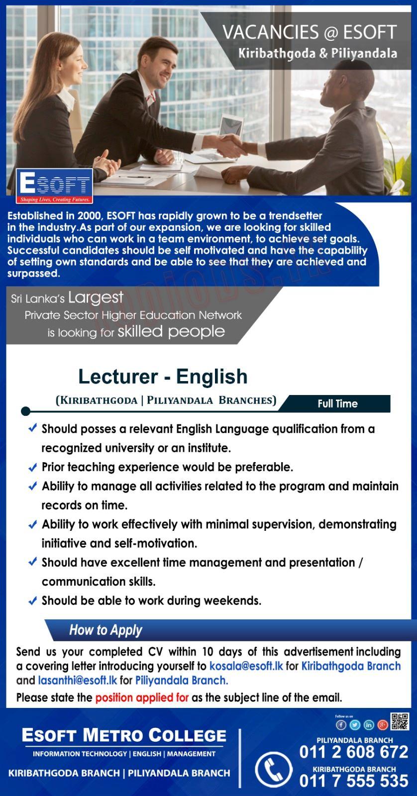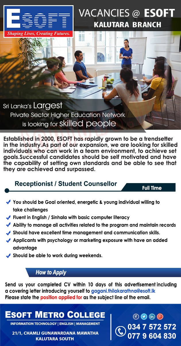 If you are interested in joining ESOFT, submit your updated CV along with a cover letter to careers@esoft.lk. Please mention the position you are applying for in the subject line.