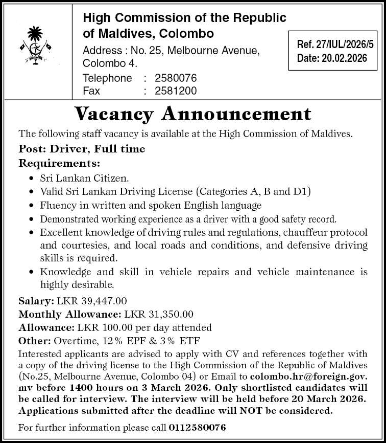 High Commission of Maldives Vacancies 2026, Are you looking for prestigious career opportunities in 2026? Here’s some good news! The High Commission of Maldives in Sri Lanka has announced new vacancies for qualified and enthusiastic individuals. Whether you have experience in administration, consular services, or public relations, the High Commission offers an excellent platform to grow your career in an international diplomatic environment.