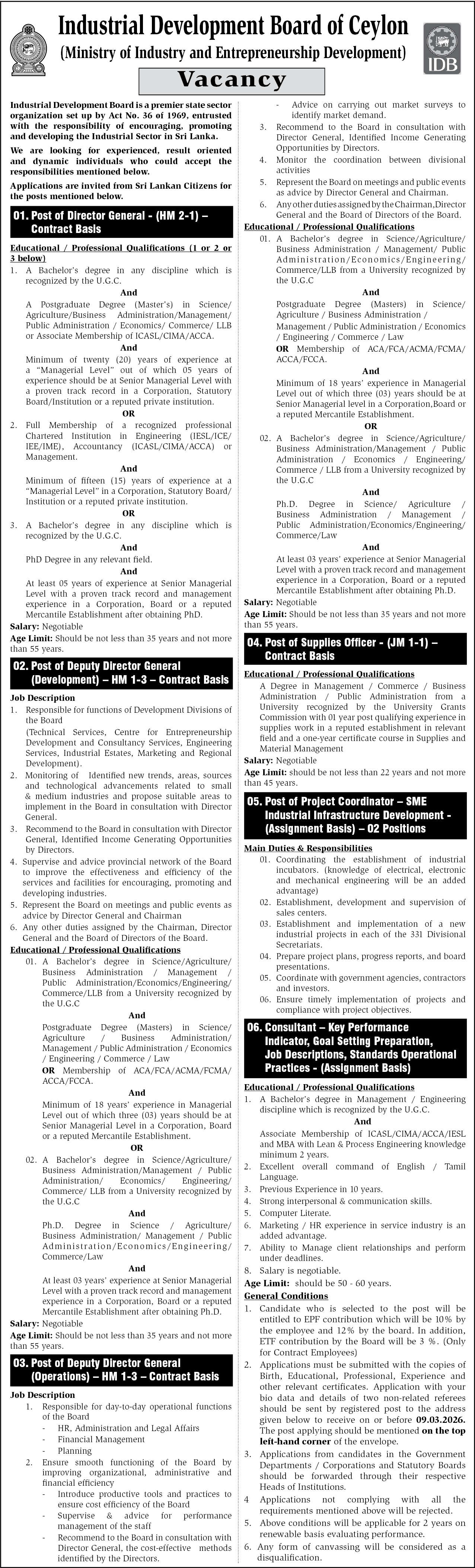 The Industrial Development Board is a premier state sector organization established under Act No. 36 of 1969, with the responsibility of promoting, encouraging, and developing the industrial sector in Sri Lanka. If you are a result-oriented and dynamic individual seeking a leadership role in the public sector, these vacancies could be the ideal career move in 2026.
