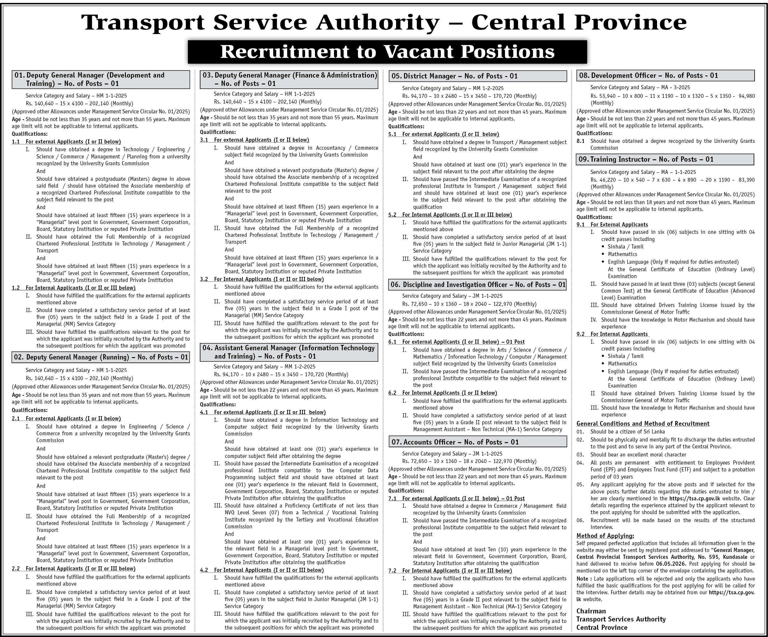 The Central Province Transport Services Authority is inviting applications for the post of Assistant General Manager (Information Technology & Training).