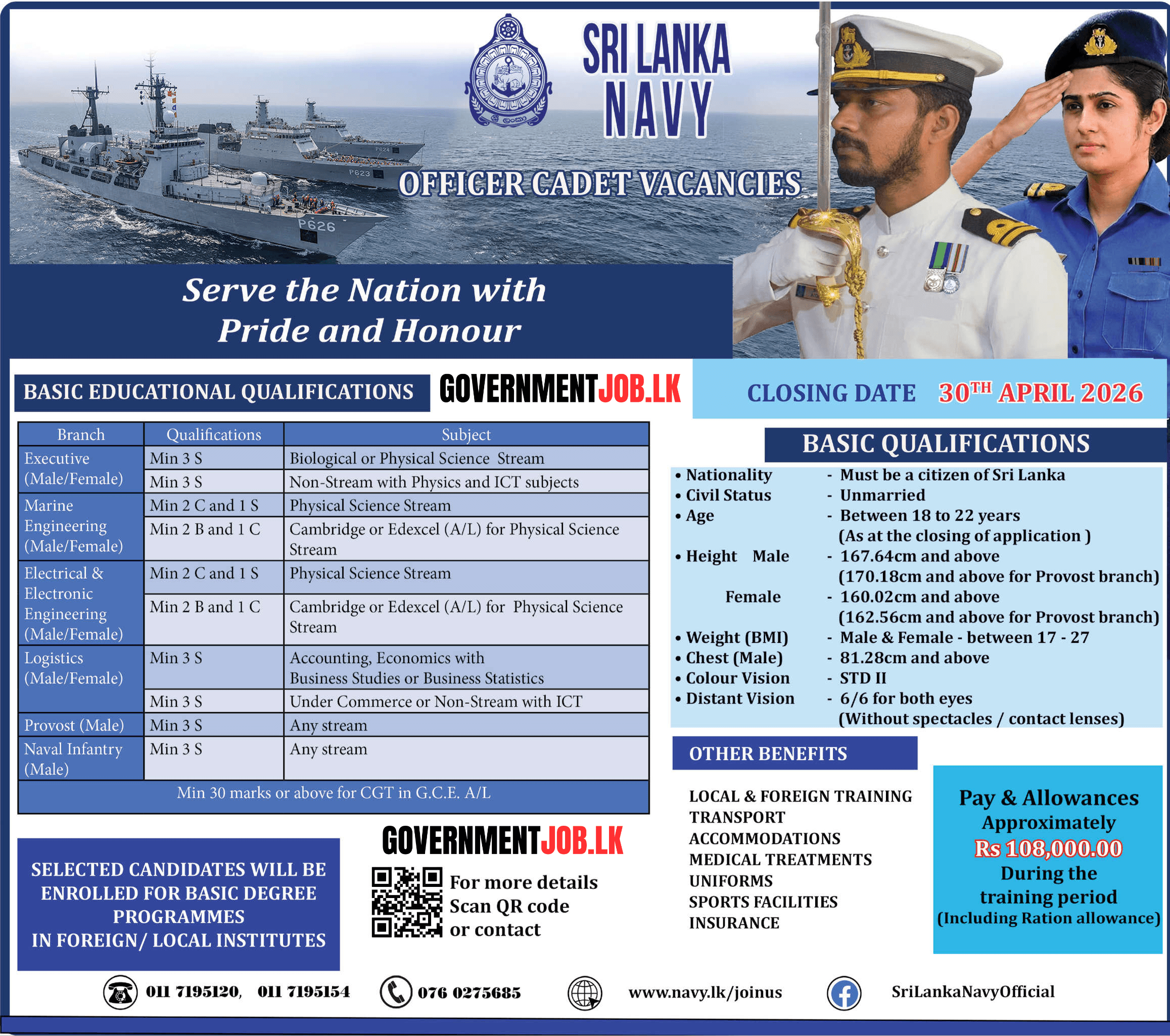 The Sri Lanka Navy is calling applications for Officer Cadet Vacancies 2026 in multiple branches. This is a prestigious government career opportunity with training, salary, and future officer-level promotions 💼✨