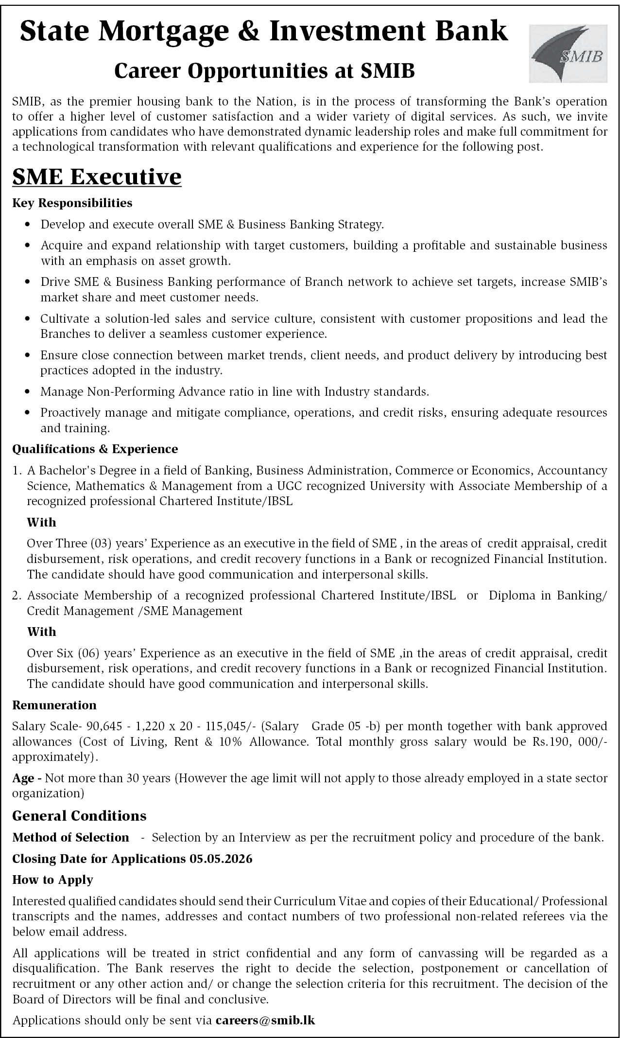 The State Mortgage & Investment Bank (SMIB) is inviting applications for the position of SME Executive.