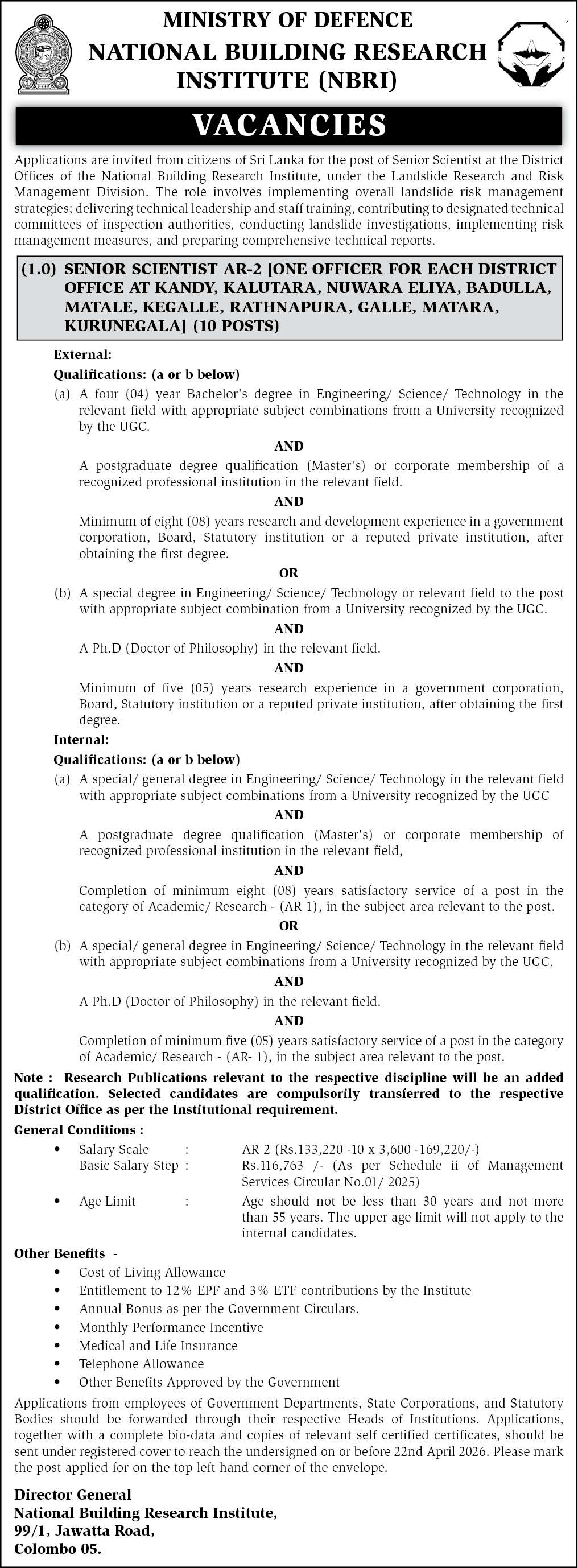 The National Building Research Institute Vacancies 2026 (NBRI) has announced a major recruitment drive for Senior Scientist (AR-2) positions across multiple district offices in Sri Lanka. This opportunity is released under the Ministry of Defence through the National Building Research Institute, a leading government research institution focused on disaster risk management and infrastructure safety.