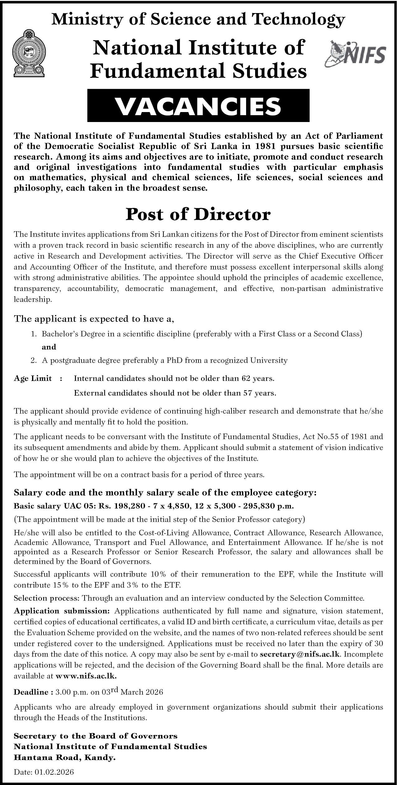 Are you an eminent scientist with a vision to lead Sri Lankaโs premier basic research institution? The National Institute of Fundamental Studies (NIFS) has officially announced a prestigious vacancy for the Post of Director for the year 2026. This is a rare opportunity for high-caliber researchers to serve as the Chief Executive Officer of the country’s leading research body located in Kandy.