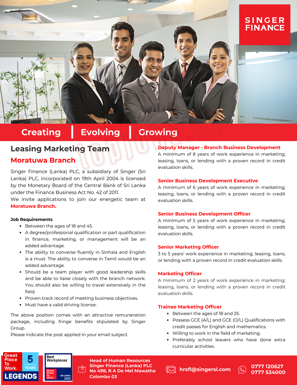 Singer Finance has been a trusted name in Sri Lanka’s financial services industry for years, offering a wide range of innovative financial solutions to individuals and businesses. Here are some reasons why joining Singer Finance could be the right move for your career: