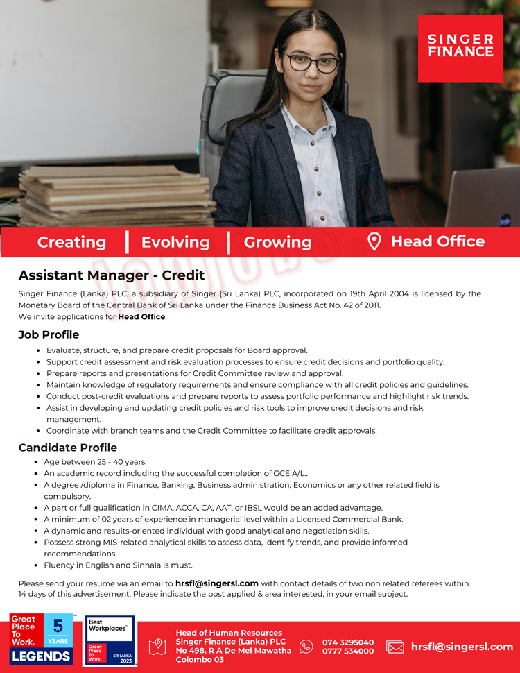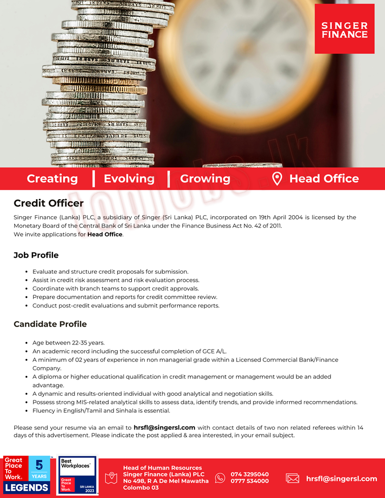 Singer Finance is expected to open up vacancies across various departments in 2026. Whether you are a fresh graduate or an experienced professional, there are plenty of opportunities to explore.Here are some of the roles likely to be available: