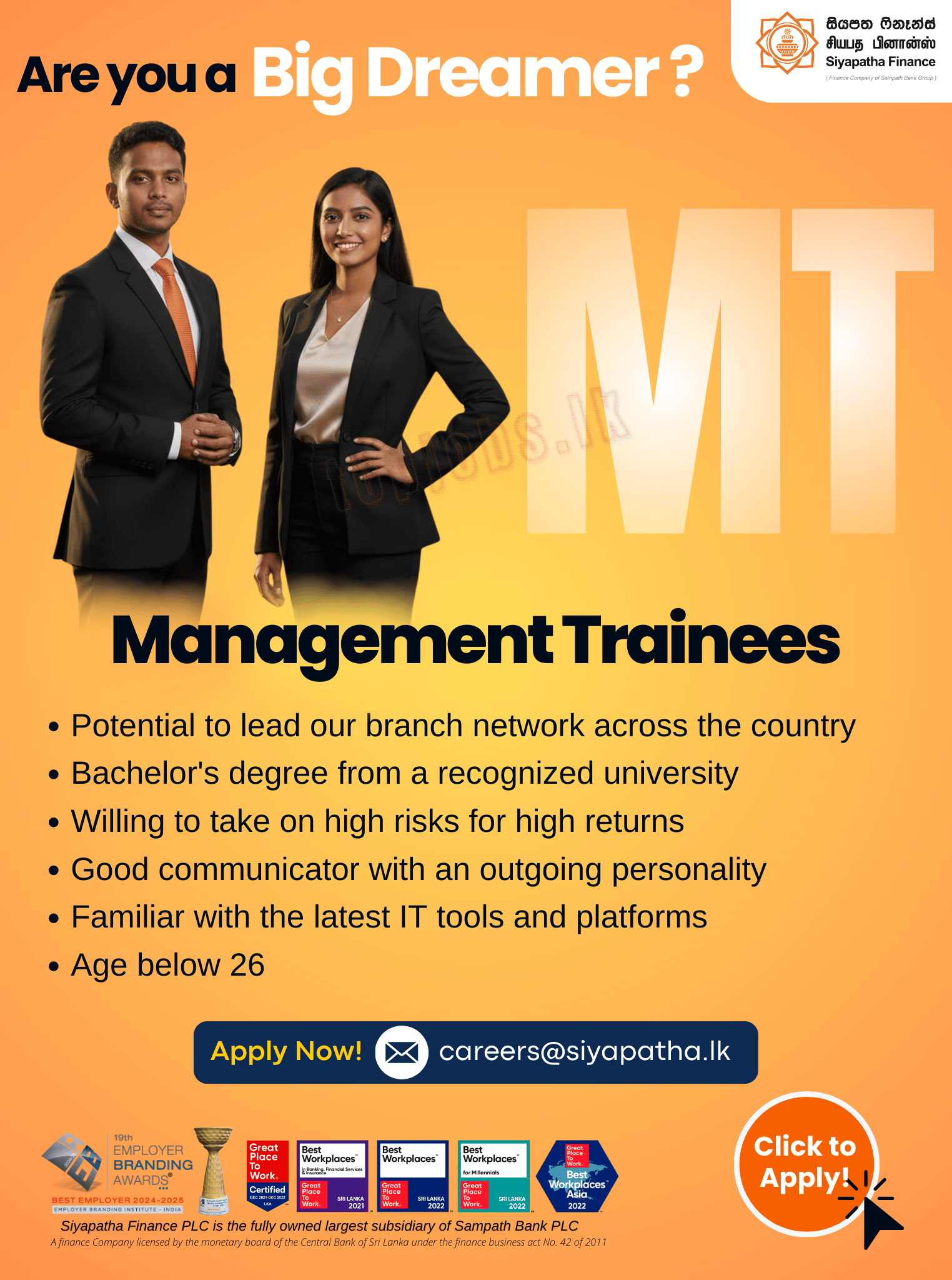 To join Siyapatha Finance, candidates typically need to meet the following qualifications: