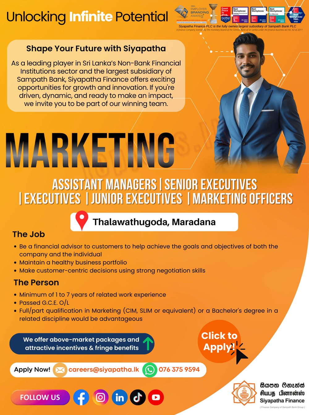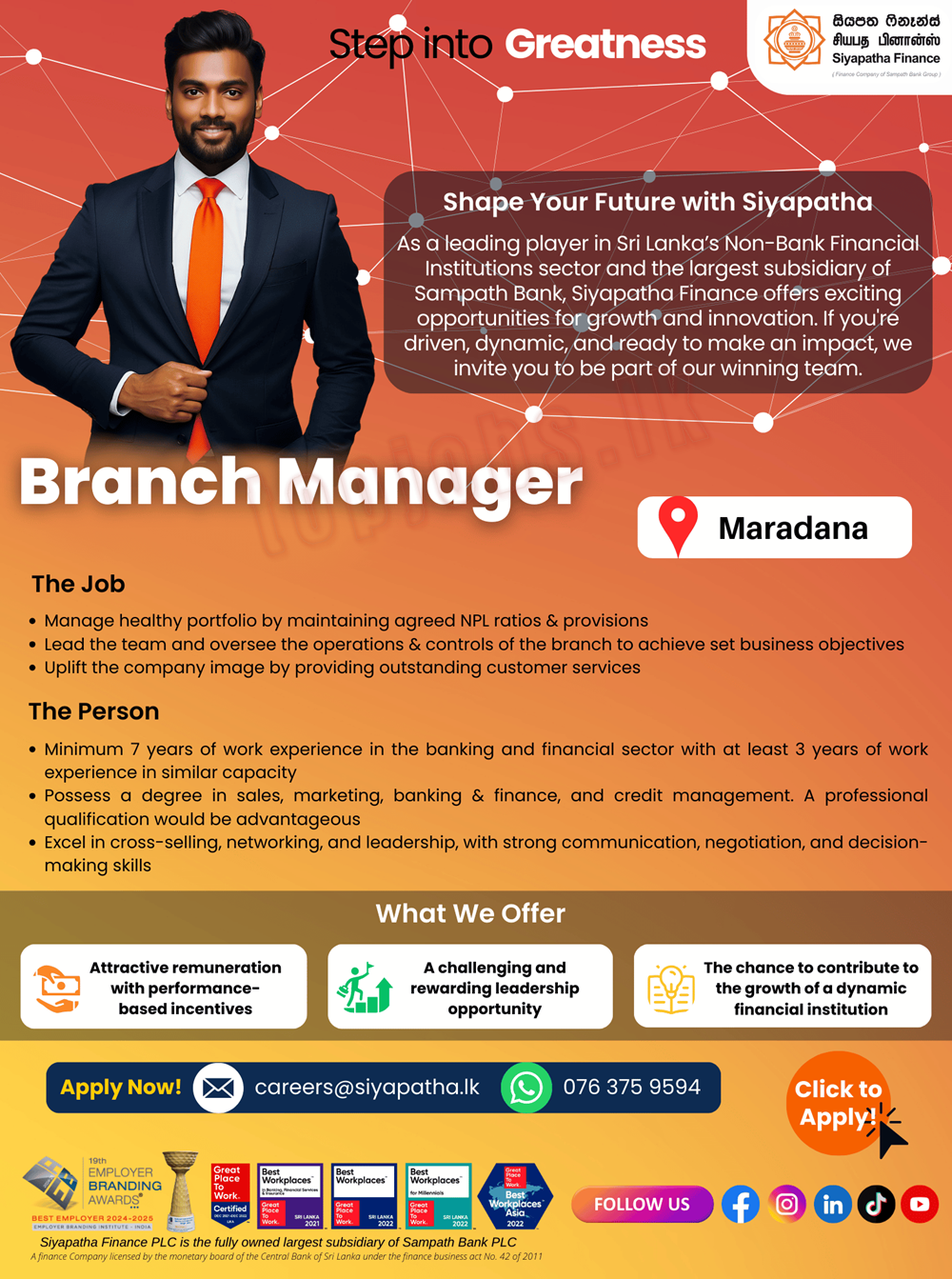 The financial sector in Sri Lanka is growing rapidly, offering numerous opportunities for career advancement and skill development. By joining Siyapatha Finance, you’ll be part of a dynamic industry that drives economic growth and empowers individuals and businesses.