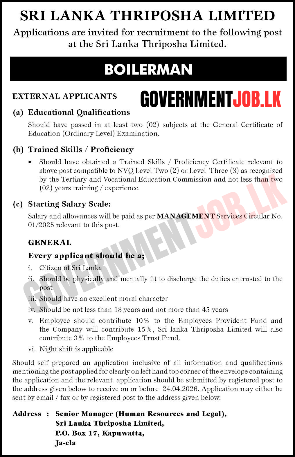 The Sri Lanka Thriposha Limited Vacancies 2026 notification has been released for the recruitment of a Boilerman position at Sri Lanka Thriposha Limited. This is a valuable opportunity for technically skilled individuals seeking a government-sector industrial job.