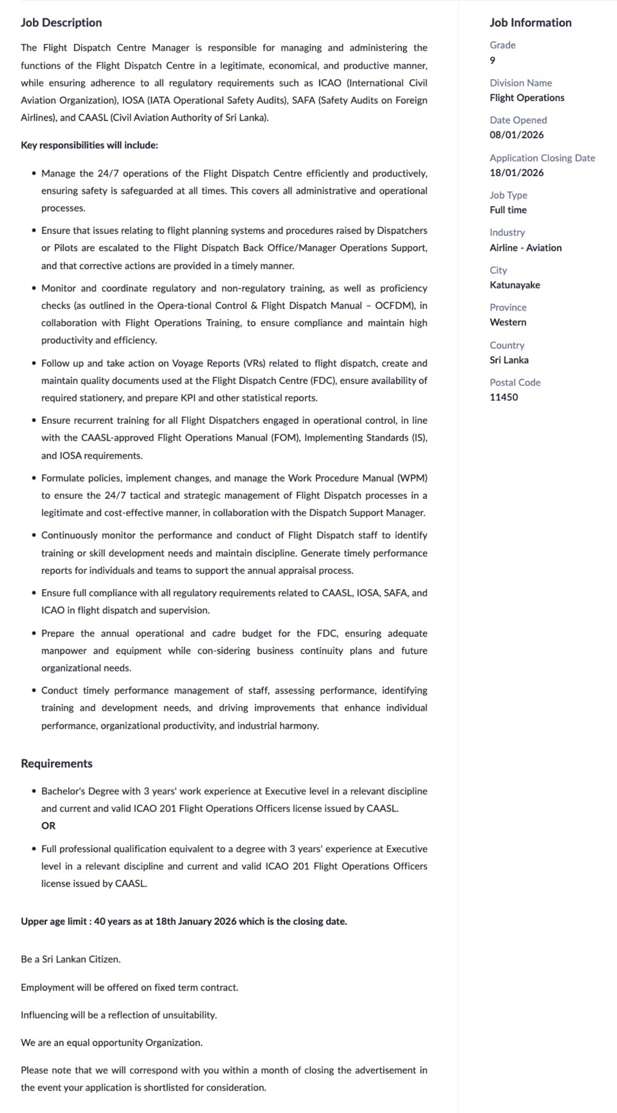 Sri Lankan Airlines Vacancies 2026 Eligibility Criteria :