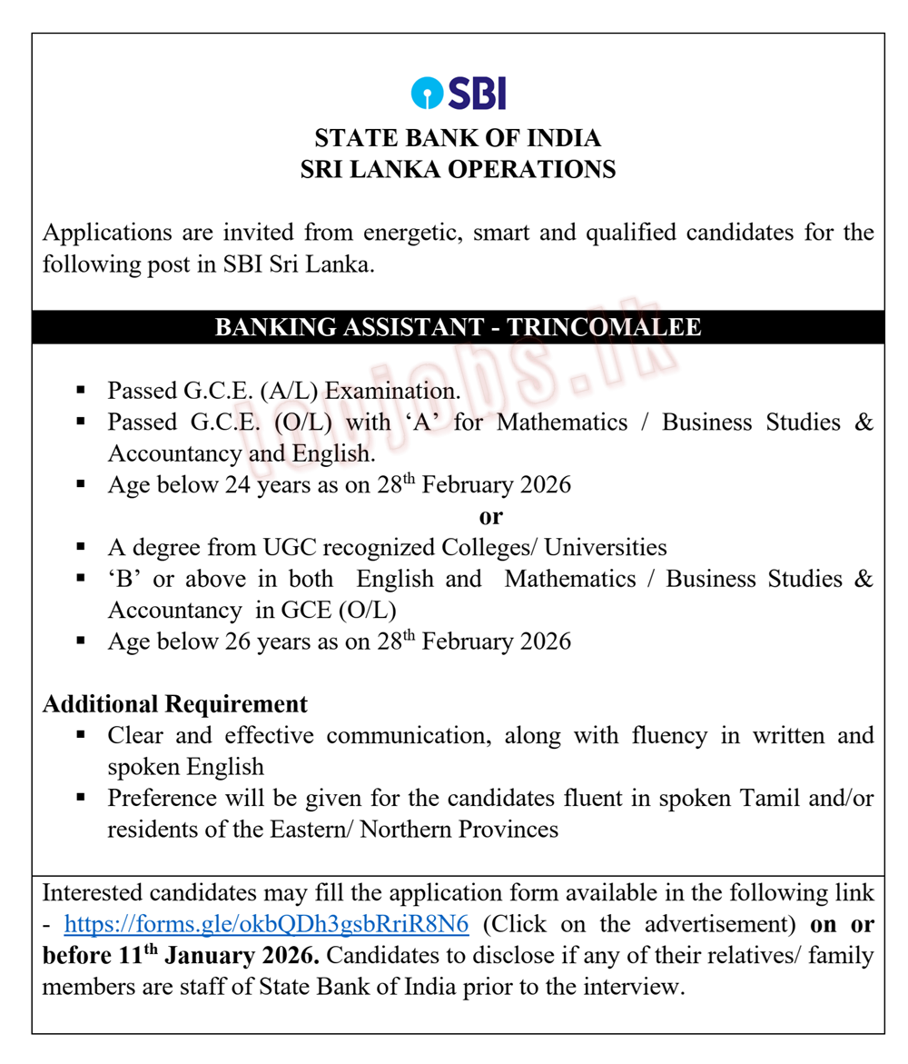 | Banking Assistant | GCE A/L + Diploma in Banking/Finance/Commerce | Not mandatory, freshers welcome |