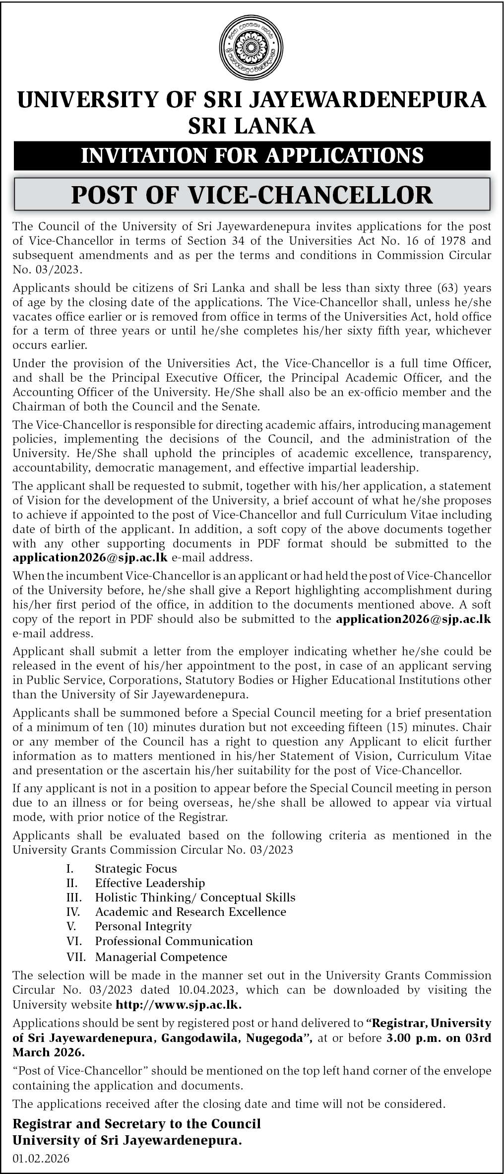 Applications prepared in accordance with the attached model application form along with certified copies of relevant certificates in support of educational and other qualifications should be sent to the address “Deputy Registrar, Non-Academic Institutions Division, University of Sri Jayewardenepura, Gangodawila Nugegoda.” on or before 15.01.2026 and the post applied for should be clearly mentioned on the top left Corner of the envelope containing the application.