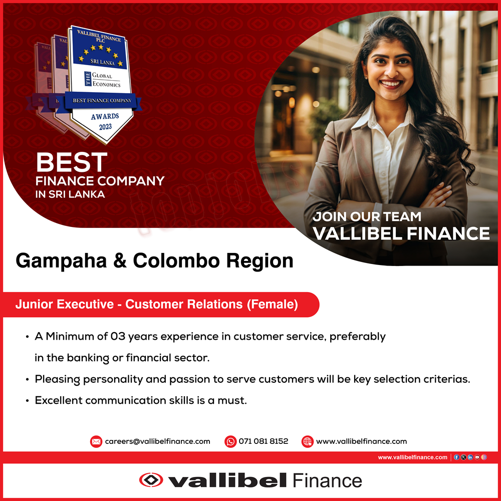 - Junior Executive – Customer Relations (Female) – Gampaha & Colombo Region